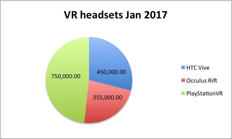 You need to play the numbers – according to Super Data Research, as of December 2016, there were 450,000 HTC Vive headsets, 355,000 Occulus Rift headsets and about 750,000 Sony PSVR Headsets sold. We also know that Microsoft is planning to produce a cheap consumer VR headset in the next year or so.