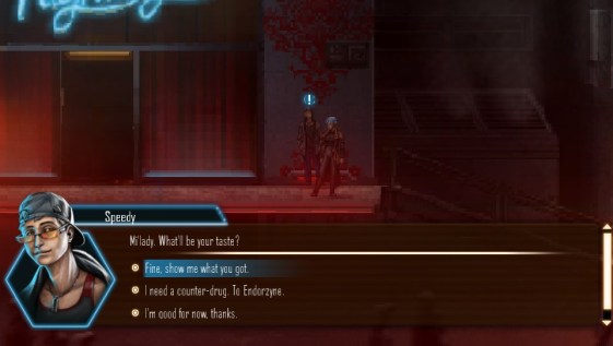I know it seems like I’m harping on this point, but DEX needed more time in quality assurance. These bugs and design decisions drained any enthusiasm I had for the game within seconds of me trying to jump back in. It’s not for lack of quality to the game itself – based on what I have played, the gameplay mechanics, story, etc. are all quite intriguing. You can use melee or ranged combat, as well as negotiate or sneak around potential conflicts. There’s full voice acting as far as I’ve seen, and the musical score’s great. You even get tough moral choices where not everyone ends up happy. DEX is a full-fledged modern RPG in every sense of the word. A lot of love, time, and effort went into this title, and I love experiencing it…