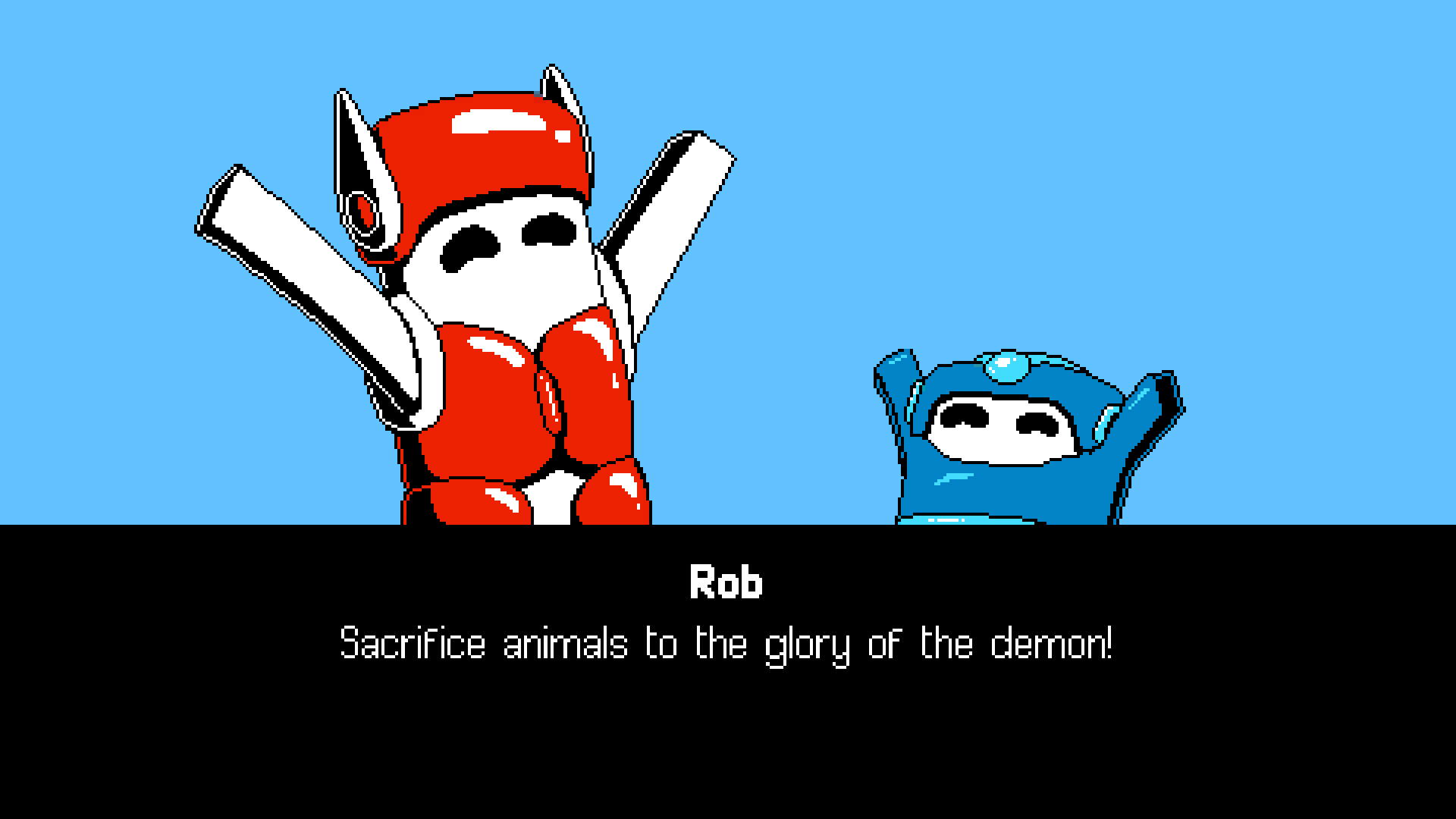 The heroes of our story are Tib (the short, sensible one) and Rob (the tall, rash one); we are introduced to their mother as well, who is inventively referred to as “Mother”. Mother has been aggressively training Tib and Rob for years, but you only get one two-minute tutorial and then the game is underway. The tutorial sadly neglects to mention that both the d-pad and the face buttons can be used for arrow inputs. This makes some of the faster patterns fairly painful to match. After you learn about that it gets much easier to match. I wish I’d realised this sooner cause my fingers would ache significantly less if I had.