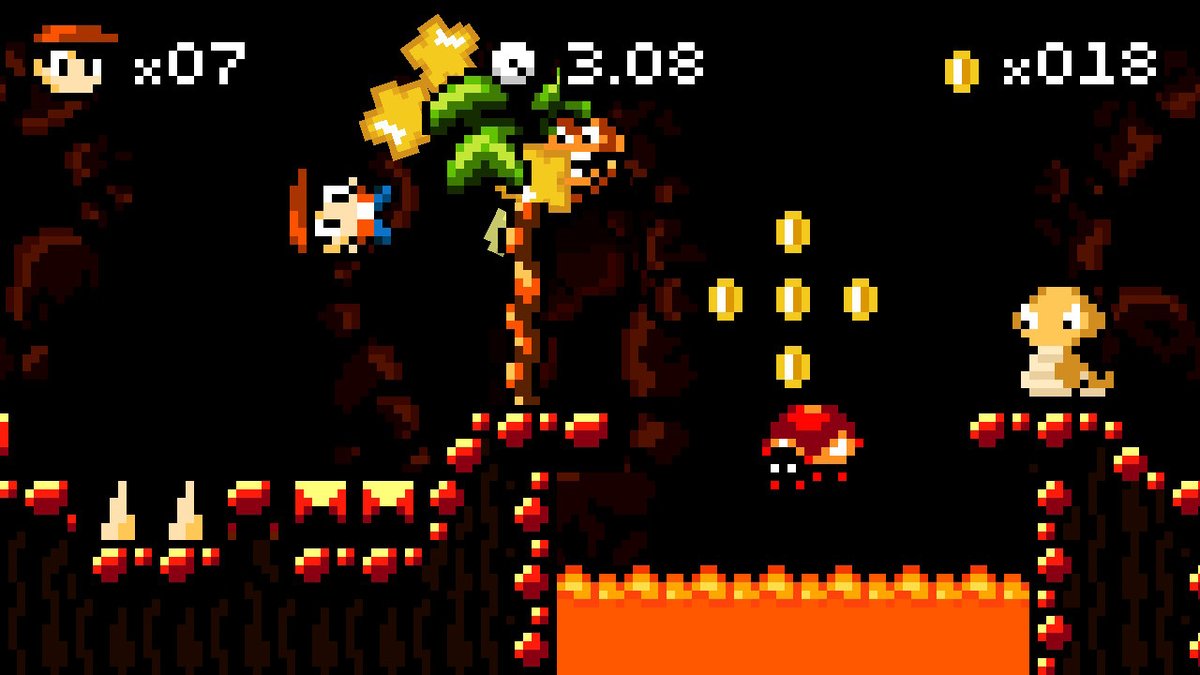 Kid Tripp looks amazing. The sprite quality is consistent. The animation is limited yet fluid. Together, the game looks really good. Being designed for a mobile device, I was originally unsure it would look great upscaled on Switch or downscaled on 3DS. I’m happy to have been proven wrong in that worry. Everything is crisp and blur free. The feeling I get while moving is that it’s right just for the system. The sound design and quality sells it as a arcade inspired game. Each world theme feels different, yet oddly similar in style. The sound effects feel ripped straight from the Genesis. It’s nice to play a game that tries to remind of the past while keeping its foot in the modern era. Some level backgrounds blend in too much with enemies and obstacles. A lot of the time it felt like the game was at fault for my death. Which is, under any circumstances, terrible.