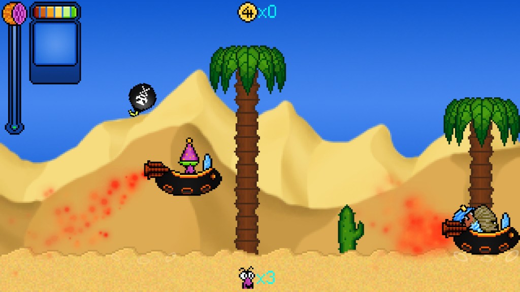 Now onto the review, you play as a purple character that reminds me of a child version of the California Raisins, like from the beginning videos before movies on the big screen. Some of you… well many of you probably don’t know what I’m talking about, I’m old, the videos before movies at movie theaters use to have some videos about the snacks and stuff. One of them was about walking talking raisins and the only ones I can think of are the California Raisins. They aren’t shown anymore as far as I know. Anyways, the baddie of the game calls you the pink guy, even though you are clearly purple. You have gone treasure hunting, found the three Eternity Crystals, well the bad guy has apparently been tracking you and it steals them from your raisin-y ass. You immediately steal it back but the ship explodes and you’re sent to the planet below. It’s up to you to find the crystals so EVIL doesn’t get a hold of them because crystal has the power of one of the three guardians of the universe. Who are big chested uhhh things or some sort.