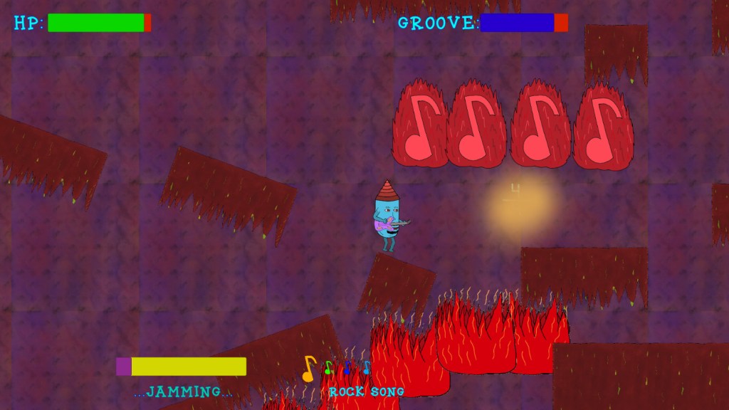Drilly Willis is a metroidvania game where you play as a drill-headed man named Drilly Willis. You’re a rocker and you were playing for a crowd when Flash Clappy showed up and banished you with his magical bullshit powers. You’re now trapped in a world, your music has been lost, your guitar has no strings, and your tuners are gone. You have to find a way out of Clappy’s shit world and back into the normal one.