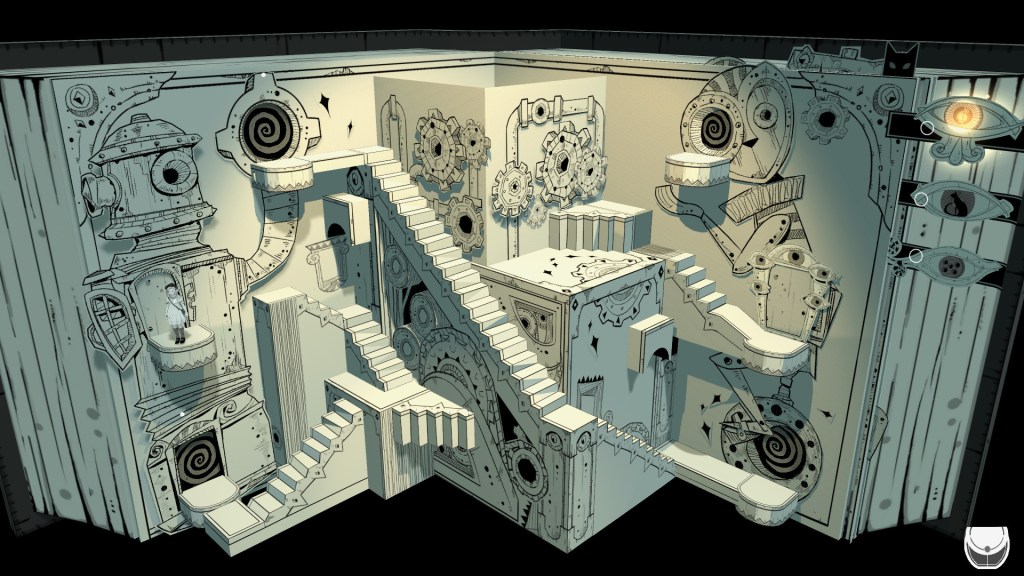 The gameplay is simple, you walk around, collect stuff to solve some puzzles and change into a shadow where you can interact with other shadows, this lets you move about in the shadow uhhh world I guess for a lack of a better word. As a shadow you can collect a few things but it’s mostly there so you can get places you wouldn’t be able to in the normal world. A good example of this shadow gameplay, to help explain it, you have to be in light so that your shadow is cast and a book has to be in that light too, when you move to the shadows you can walk around on shadows cast by objects that you can’t actually walk on. Let’s say there’s a stairway, the bottom and top exist but the middle of the stairwell has broken and fallen away, that leaves a gap Iris can’t jump. However, you find a tiny metal pipe, you place it on a machine and change the light so that the staircase casts a shadow and the tiny pipe casts a huge shadow across the two parts of the stairwell. At this point she can go into the shadow world and walk up the stairs, cross the pipe’s shadow to the next set of stairs and move up those steps to the next book. A lot of the puzzles involve turning on lights and using the shadows to solve puzzles either by creating paths in the shadow that Iris can travel or by using shadows to interact with other shadows in order to cause things to move (see picture). The point and click bits are pretty fast and easy, you pick something up and typically use it within a few seconds in the same room you picked it up at which makes that a lot easier to deal with and they always make sense.