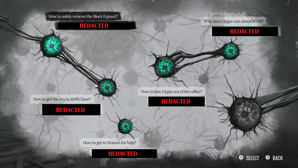 That’s not all you have to do however. You’ll also have to examine the evidence by thinking about it. This is cleverly done through a series of synaptic pathways in the menu. Each synapse is red until you solve the puzzle, then it turns green to indicate success. However, if you don’t have the right clues, you can’t solve the mystery and you’ll end up wandering around in circles. Solving the puzzles in your mind requires you to link the clues to the question. Again, this is poorly explained by the game but there are three colors of clues and several points in each synapse to connect them to. Select the right clue and it lights up, locking into the port on the synapse like a chemical receptor. Fail and that clue temporarily disappears. As you make your way through stages, you add a plethora of clues that can come in handy in figuring out what’s going on or what to do next. Each time you match them to the synapses, it helps to progress the main storyline. It’s an interesting system that takes a bit of getting used to. Oh…and NO SPOILERS FOR YOU!