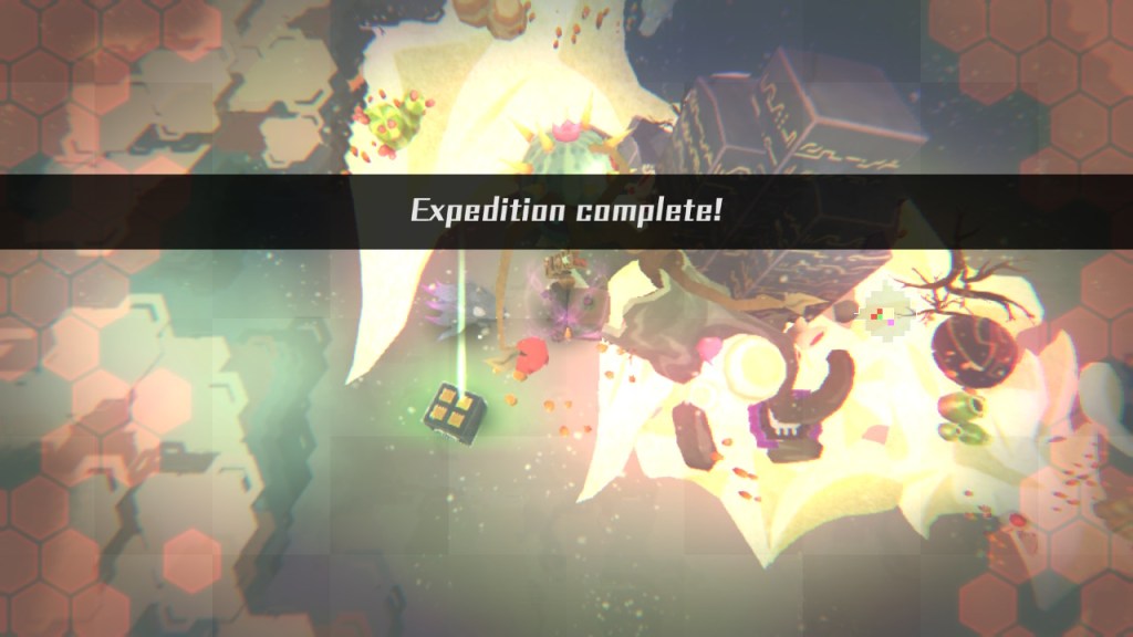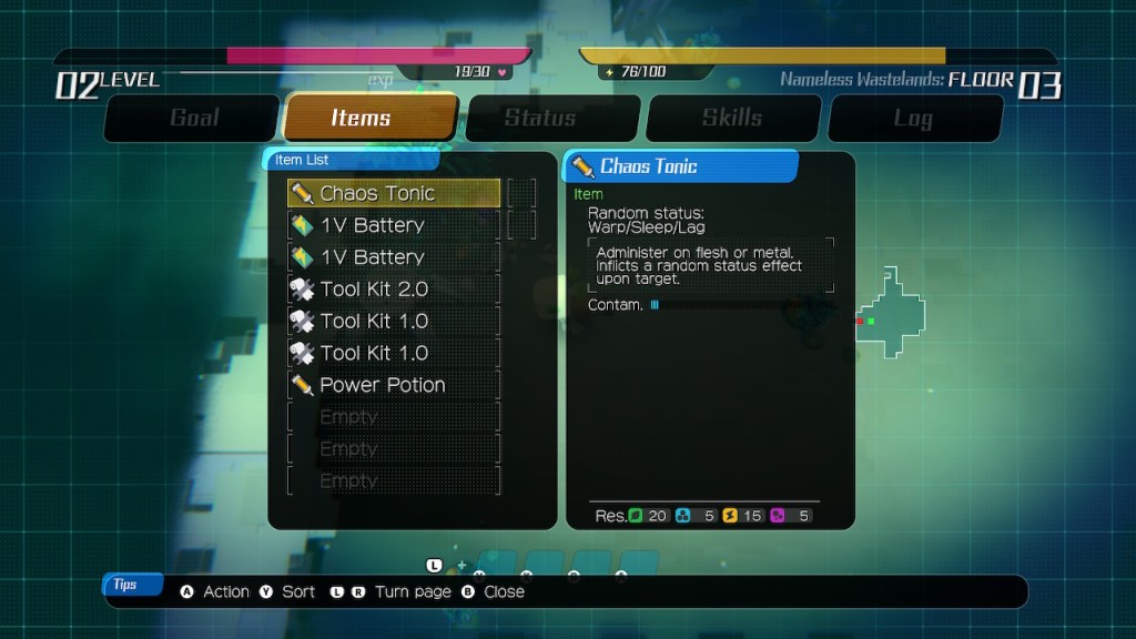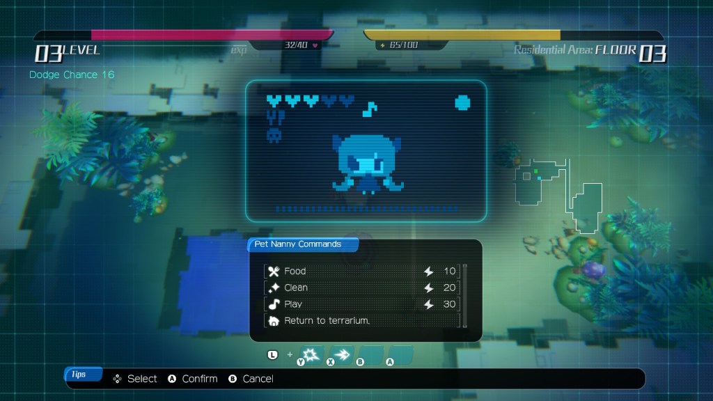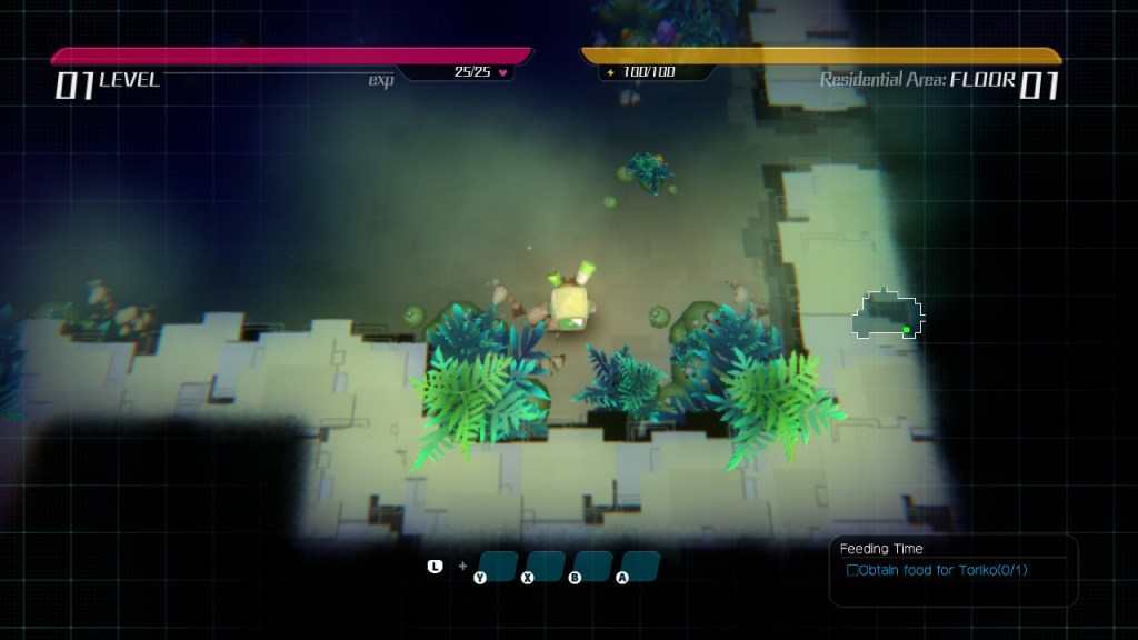 Robbie moves in a grid pattern, slowly collecting resources and items to bring back to the terrarium. Weapons, shields, food, and items are all both useful in combat and can be broken down as ingredients to improve Toriko’s terrarium. Your inventory is limited and some items are corrupt so it pays to be careful what you bring back, but you’ll need it all eventually. Each time you start a dungeon, you return to level 1 but don’t worry. Like all well-designed roguelikes, there’s are permanent stat gains as well for both Robbie and Toriko again, in this case generated by creating new items for Toriko.