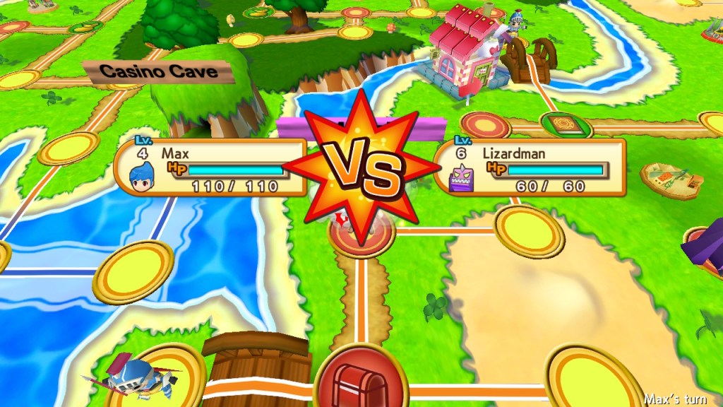 This isn’t a complex game by any means. In Dokapon Kingdom, you spin a standard 6 slot spinner in order to find out how far you can move. Wherever you can reach with the number you roll is how far you can move and the game even conveniently highlights the potential options. Land on an empty spot and you fight a random enemy. Land on a monster and you’ll fight them. But this isn’t a normal Mario Party-style game either. There’s a distinctive RPG flavor to the gameplay and as you fight enemies, you level up and gain gold, allowing you to upgrade your character’s weapons, armor, spells, and items. These upgrades are necessary to survive in Dokapon Kingdom, a challenge at the best of times.