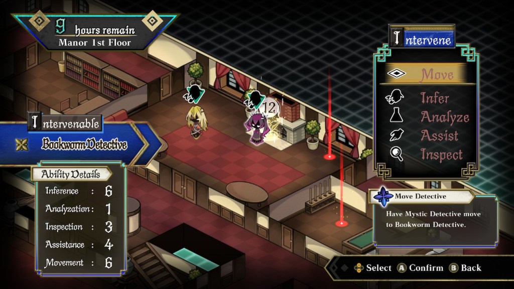 Regardless, if you want to proceed, you’ll have to figure things out and that’s where Process of Elimination kind of falls flat. Making it successfully through an investigation is difficult, partly because there’s a time limit and partly because the solutions are wildly unintuitive and involve moving characters in weird ways halfway across the mansion you’re in for no apparent reason. To succeed in an investigation, you don’t even need to move everyone. You can entirely ignore some characters and just use a handful and you get the same result. On top of that, there’s even an option to move a character anywhere in the house at a cost of only a single turn. How would you just know that? Who can say? Certainly not the game itself!