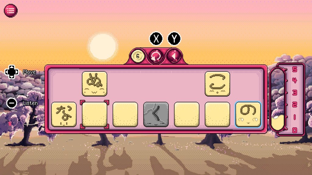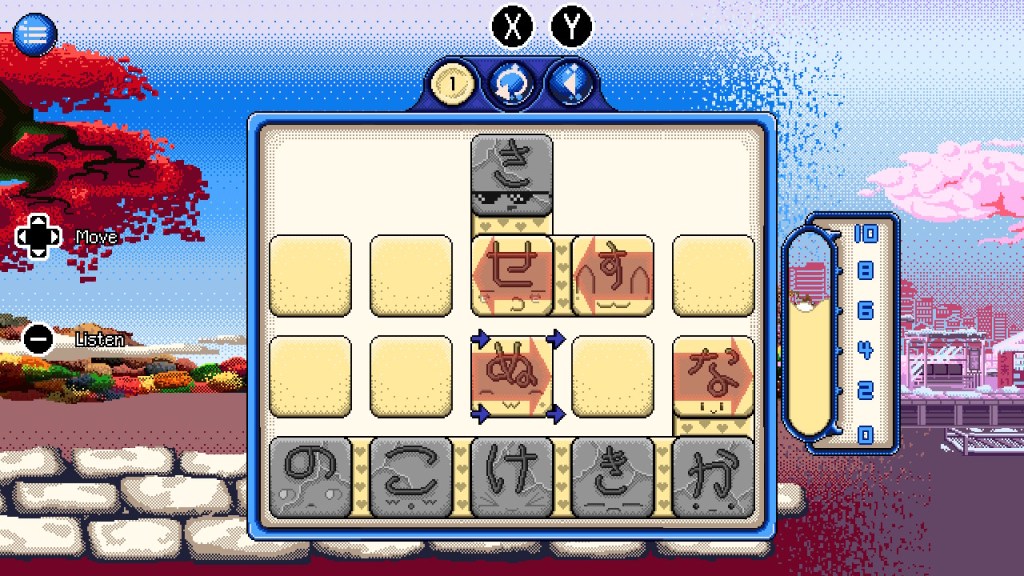 There’s plenty of help in Kana Quest though. In addition to an undo button and a reset, you can actually go into the menu settings and unlock every single level and world in the game right off the bat. Don’t feel like you’re stuck because that isn’t the goal of this game. The entire goal, and one Kana Quest sort of succeeds at, is to make you learn to recognize the sounds of the hiragana alphabet through symbols. Can you do that here? Sure, if you’re paying close attention. However, you can always flip the tiles over to see their sounds written in Western letters instead, allowing you to just match the sounds without learning the symbols, making this a weird little sound matching game. Even just playing a few levels in the beginning, it’s easy to get into the habit of ignoring the Japanese symbols and just listening to the sounds to arrange them. That bypasses the entire purpose of the game, so in that sense, Kana Quest kind of fails because unless you’re determined to learn hiragana, you can absolutely avoid it and play the game.